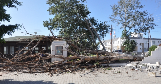 Güzelyurt Festival Parkı’nda bulunan tarihi kavak ağaçlarından biri aşırı rüzgarın etkisiyle devrildi.