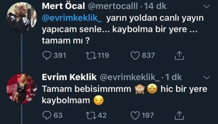 İkilinin Instagram'dan yaptığı yorumlaşmanın yankıları sürerken bir bomba da Twitter'dan geldi. Mert Öcal'ın "Yarın yoldan canlı yayın yapacağım seninle. Bir yere kaybolma." mesajına Evrim, 'bebişim' hitabıyla cevap verdi. Keklik, "Tamam bebişim. Hiçbir yere kaybolmam" dedi.