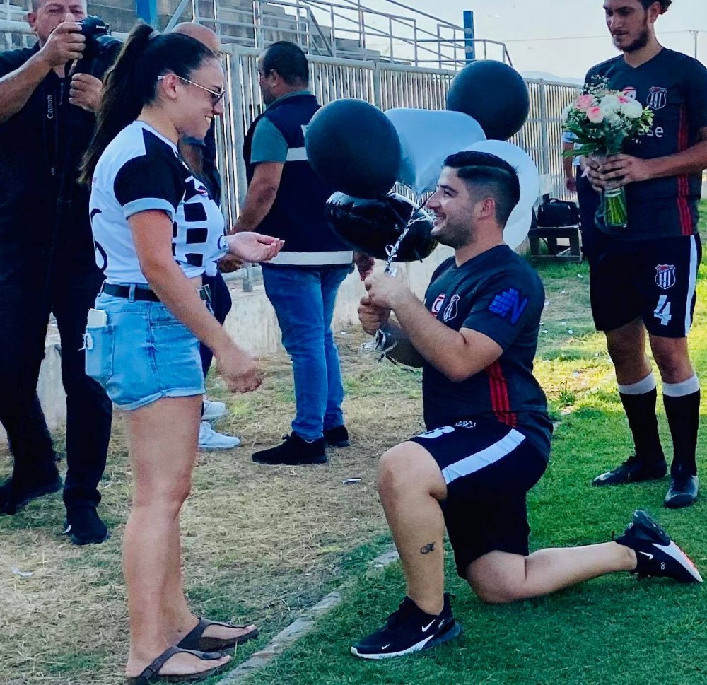 Evlilik teklifinin yazılı olduğu ve fotoğraflarının bulunduğupankartı gören genç kız, büyük bir şaşkınlık yaşadı. “Benimle evlenir misin?” yazan pankartın önünde genç çift, birbirine sarıldı. Takımın renklerindeki balonlar ve romantik müzik eşliğinde Zihni Öztürk, yüzüğü Remziye Şafaklı'ya taktı.(Mha)