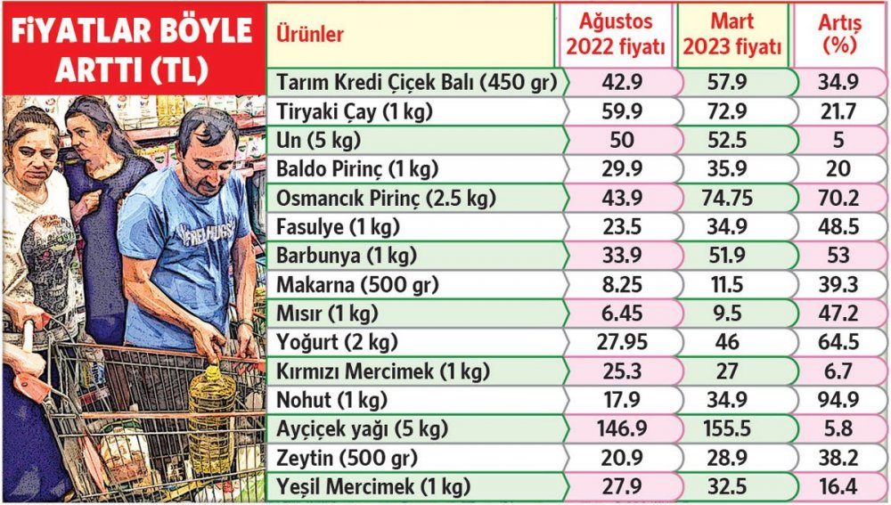 Yüzde 100'e yaklaşan zamlar oldu. Söz konusu dönemde 450 gramlık Tarım Kredi Çiçek Balı'nın fiyatına yüzde 35'e yakın, 1kilogram baldo pirincin fiyatına yüzde 40'a yakın, 1 kilogram fasulyenin fiyatına da yaklaşık yüzde 50 zam yapıldı. 2022 yılı Ağustos ayından bu yana İki kilogram yoğurdun fiyatındaki artış da yüzde 65'e yaklaştı.