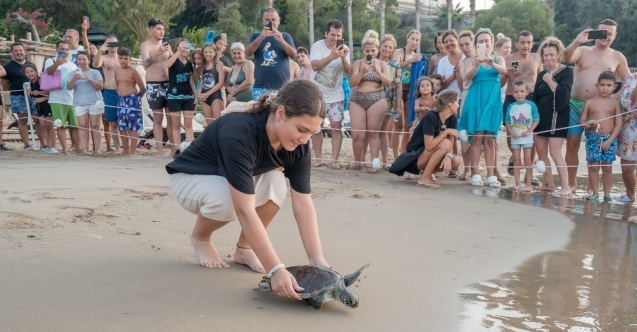 Tedavisi tamamlanan 5-8 yaşlarındaki Lapidos ismi verilen yavru deniz kaplumbağası Merit Otelleri bölgesinde denize bırakıldı