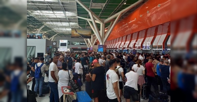 Uzun kuyrukların oluştuğu terminal binasında klimalar da çalışmayınca bir buçuk saat check in sırası bekleyen yolcular isyan etti.