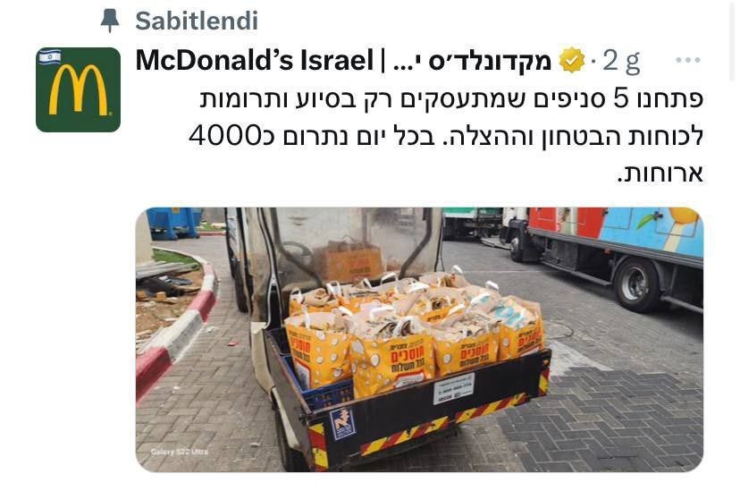 Şirketin dün yaptığı paylaşıma göre, Mc Donald’s son birkaç günde Gazze Şeridi çevresinde askerlere, polislere, hastanelere ve yerleşimcilere toplamda 12 bin kutu yemek dağıttı. Sadece askerlere yemek dağıtım amaçlı 5 restoran açıldı.