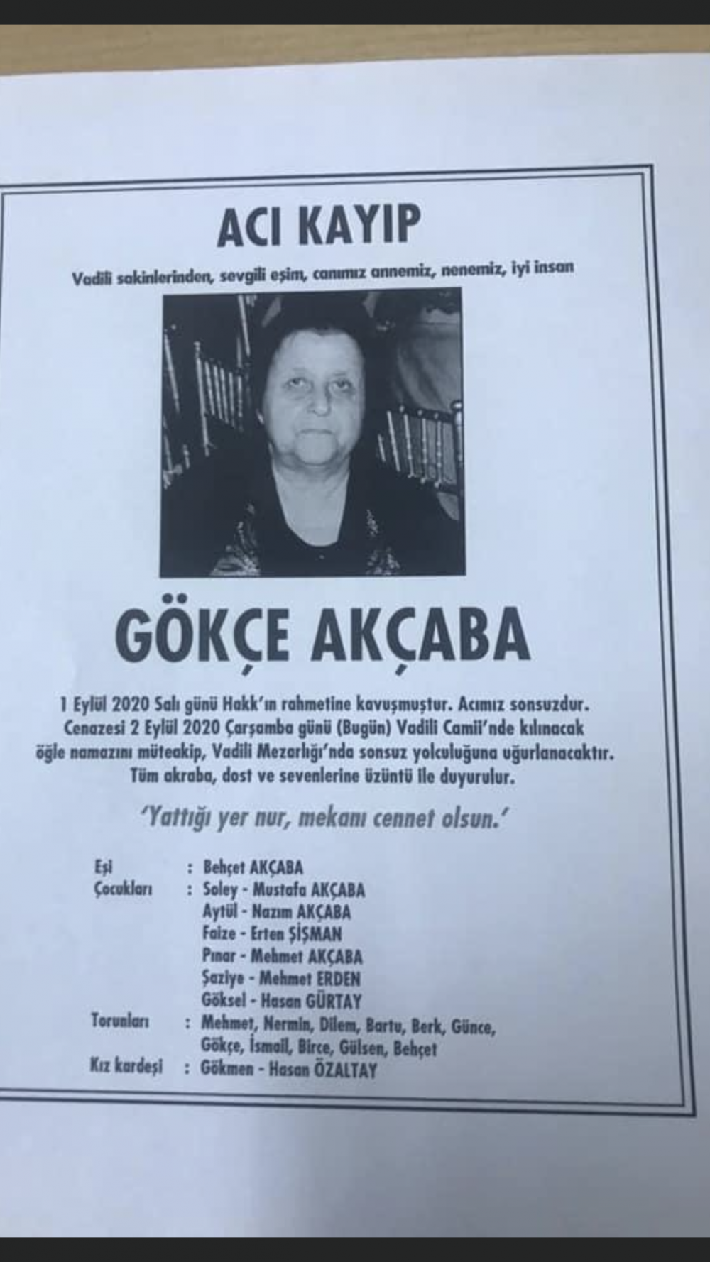 Akçaba'nın cenazesi 2 Eylül Çarşamba günü Vadili Camisinde kılınacak öğle namazının ardından Vadili mezarlığında toprağa verilecek.