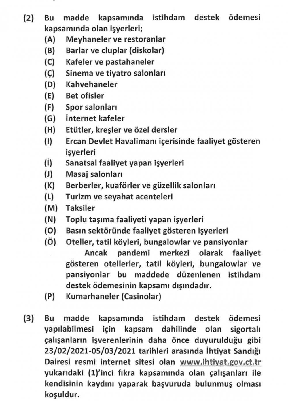 Ancak pandemi merkezi olarak faaliyet gösteren otellerler, tatil köyleri, bungalowlar ve pansiyonlar bu maddede düzenlenen istihdam destek ödemesinin kapsamı dışındadır.