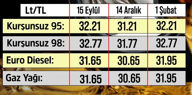 UBP – YDP – DP Hükümeti, akaryakıt fiyatlarına 1 TL zam uyguladı.Resmî Gazetede dün yayınlanan ve bugün yürürlüğe giren düzenlemeye göre,