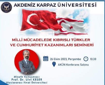 Bu çerçevede, 26 Ekim, Perşembe günü saat 10:30'da Prof. Dr. Ulvi Keser tarafından "Milli Mücadelede Kıbrıslı Türkler ve Cumhuriyet Kazanımları” Semineri, Akdeniz Karpaz Üniversitesi Konferans Salonunda gerçekleştirilecek.