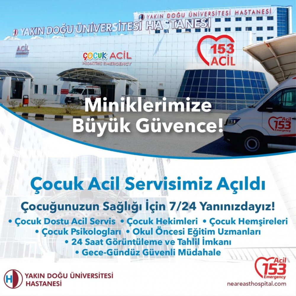 Deneyimli hekim kadrosu ve donanımlı alt yapısı ile bütün branşlarda adanın nitelikli sağlık hizmeti ihtiyacını karşılayan Yakın Doğu Üniversitesi Hastanesi, hizmete açtığı “Çocuk Acil Servisi” ile hizmet ağını genişletmeye devam ediyor. “Çocuk Dostu Acil” konseptiyle hizmet verecek olan çocuk acil; 7 gün 24 saat çocuklara özel hizmet sunacak. Deneyimli çocuk hekimleri, pediatride eğitimli hemşireler, çocuk psikologları, okul öncesi eğitim uzmanları, çocuk acil servis personeli ve 24 saat kesintisiz görüntüleme-laboratuvar imkanı ile tam donanımlı olarak yapılandırılan servis, Kıbrıs’ta çocuk sağlığı alanında önemli bir ihtiyacı karşılayacak.