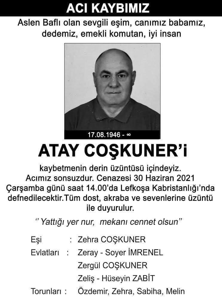 Ölümüyle sevenlerini yasa boğan Coşkuner'in cenazesi 30 Haziran Çarşamba günü (yarın) saat 14:00'te Lefkoşa Mezarlığında defnedilecek.