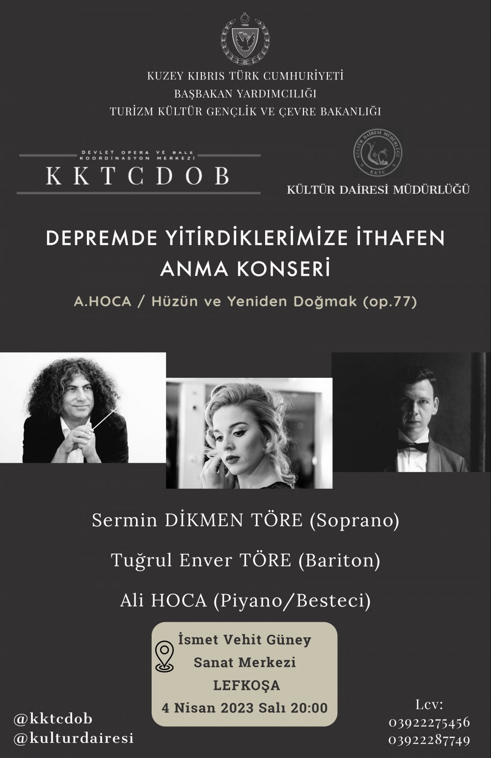 Başbakan Yardımcılığı, Turizm, Kültür, Gençlik ve Çevre Bakanlığı’na bağlı Kültür Dairesi ile Devlet Opera ve Bale Koordinasyon Merkezi’nin iş birliğinde, “Depremde Yitirdiklerimize İthafen Anma Konseri” düzenleniyor. Konser, 4 Nisan Salı akşamı Lefkoşa’da İsmet Vehit Güney Sanat Merkezi’nde yer alacak.