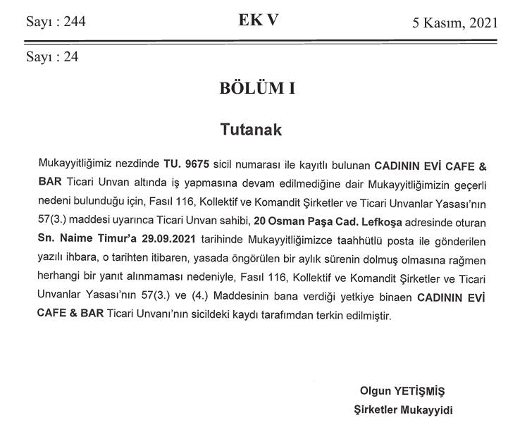 Naime Timur’un uzun yıllar işlettiği ancak ölümünden bu yana geçtiğimiz aya kadar kapalı kalan Cadının Evi isimli cafe&barının ticari ünvanının kullanmadığı yönünde yazı gönderip 1 ay boyunca da cevap bekleyen devlet, cevap gelmeyince, sicil kaydını sildiğini Resmi Gazete’de yayımladı!