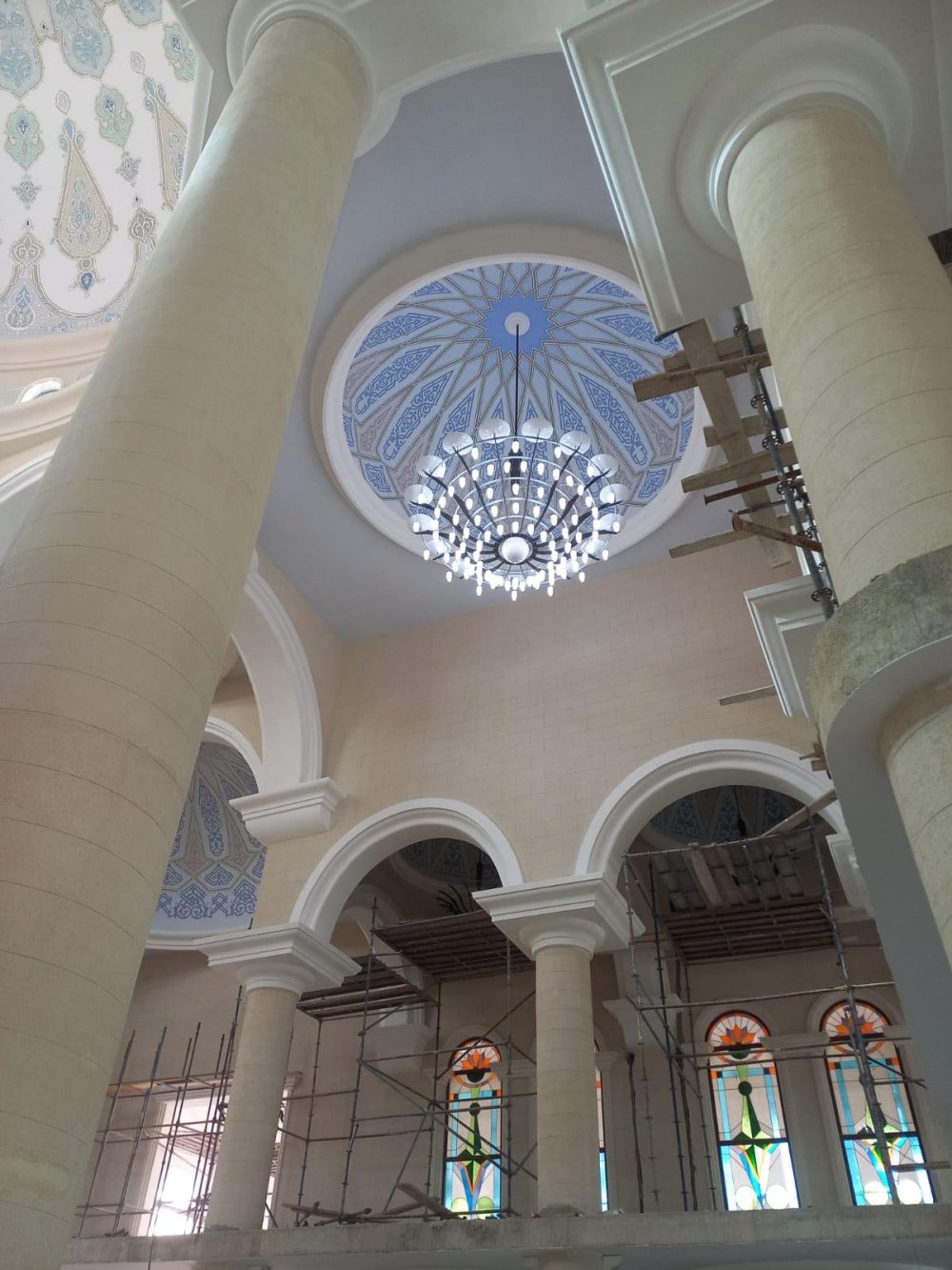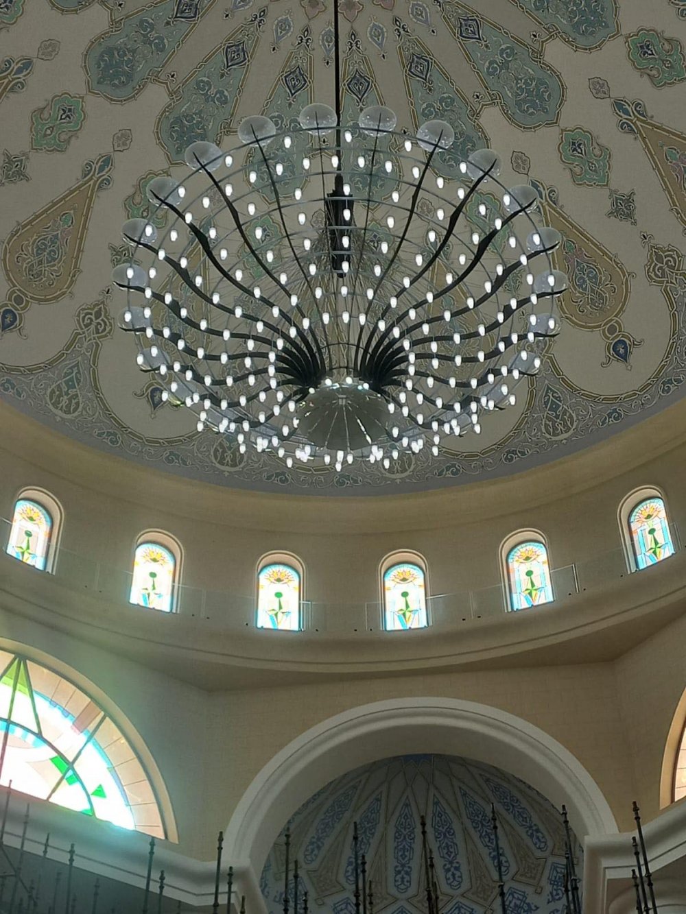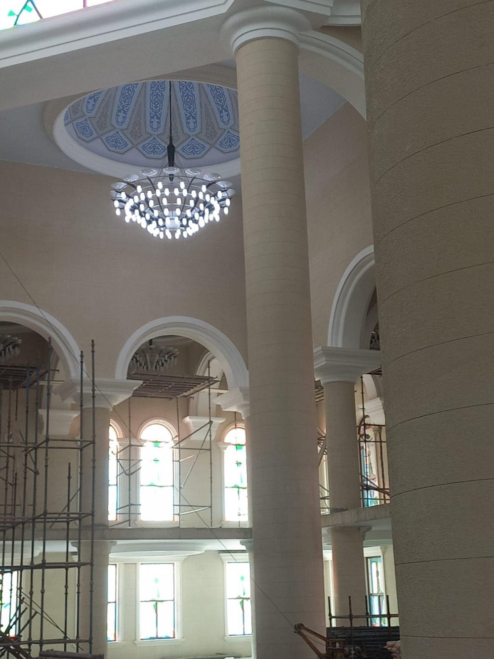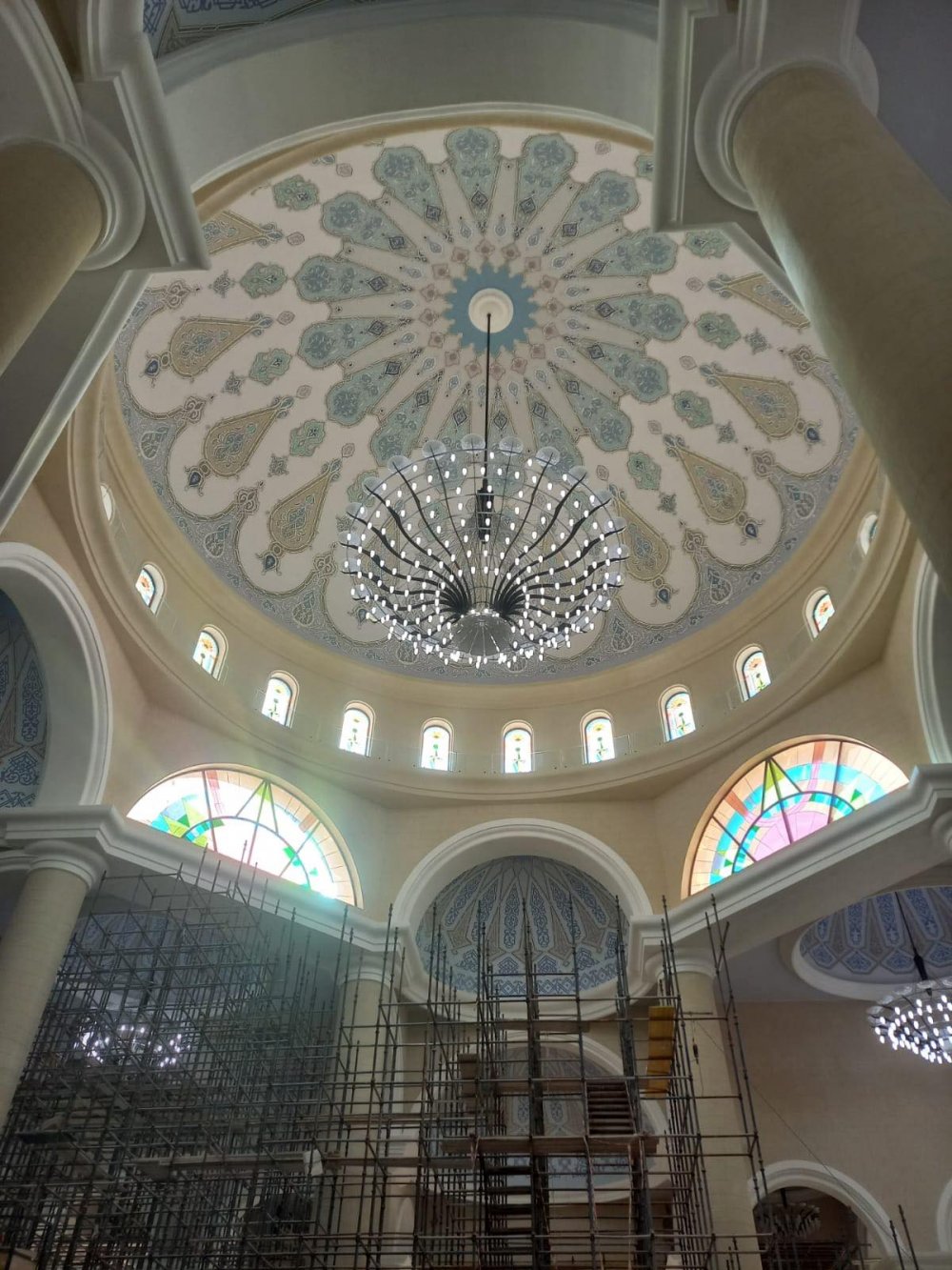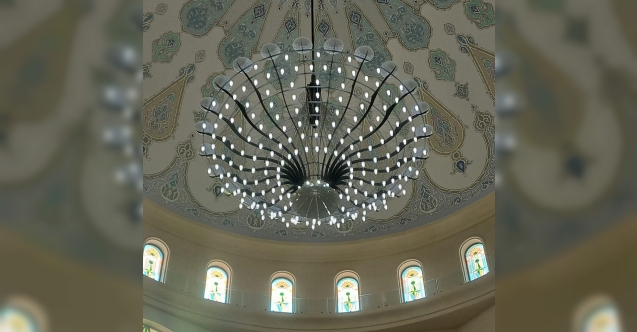 Dr. Suat Günsel Camii’nin el işçiliği kubbe süslemelerinin ardından, merkez avize de ana kubbedeki yerini aldı.