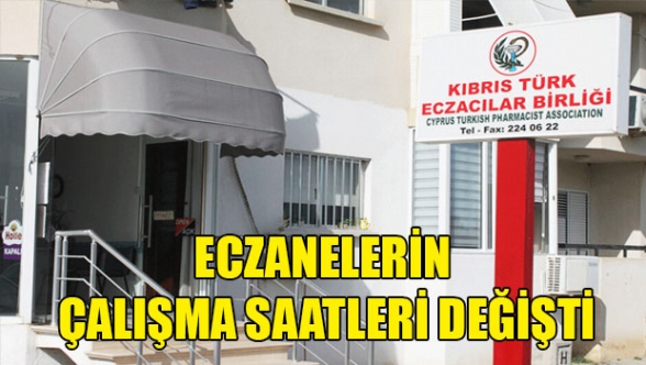 Yeni düzenlemeye göre, Lefkoşa, Mağusa, Girne-Lapta-Alsancak-Karşıyaka, Güzelyurt bölgelerinde bulunan eczaneler, hafta İçi 08.00-17.30, Perşembe 08.00 -13.30 (öğleden sonra kapalı olacak), Cumartesi ise 08.00-13.30 saatleri arasında açık olacak.