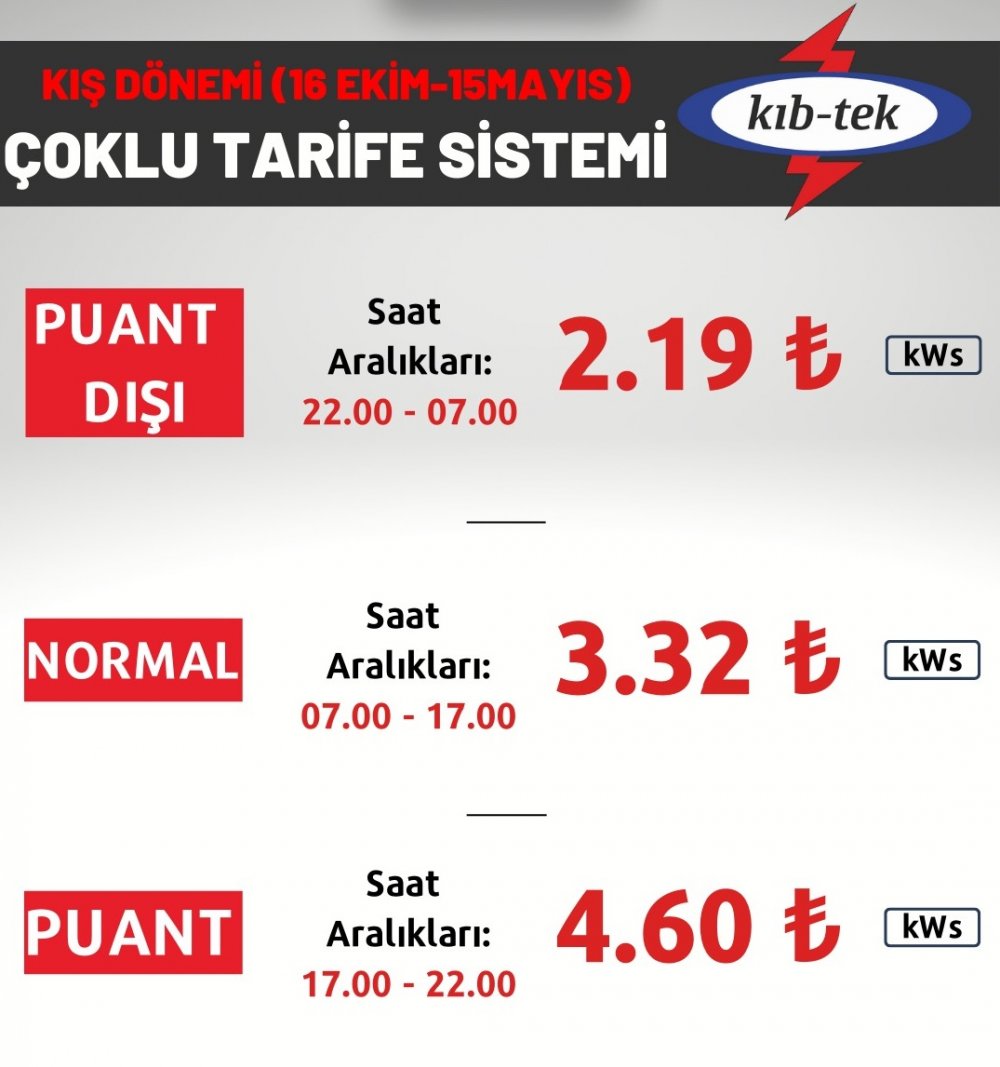 Buna göre, “kış dönemi” diye adlandırılan 16 Ekim - 15 Mayıs tarihleri arasında, “normal zaman” diye adlandırılan sabah saat 07.00'den akşam üzeri 17.00'ye kadar, elektrik fiyatı Kilowatt saat (kwh) başına 3,3285TL, “Puant” adı verilen zaman dilimi olan akşam üzeri saat 17.00'den gece 22.00'ye kadar elektrik fiyatı 4.6O46TL, “Puant Dışı” olarak adlandırılan zaman dilimi olan gece 22.00 ile sabah 07.00 saatleri arasında ise elektrik fiyatı 2,1941TL olarak uygulanacak.