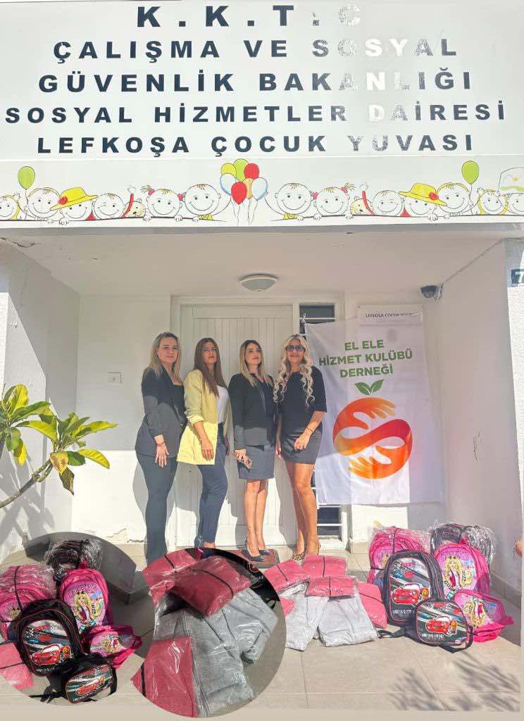 Dernek Başkanı Servet Akacan, Yönetim Kurulu Üyeleri Fazilet Çakır,Olcay Kara ve Doç.Dr. Melahat Arıklı, 20 okul çantası ve 15 takım eşofmanı Çalışma ve Sosyal Güvenlik Bakanlığı’na bağlı Lefkoşa Çocuk Yuvası yetkililerine teslim etti.
