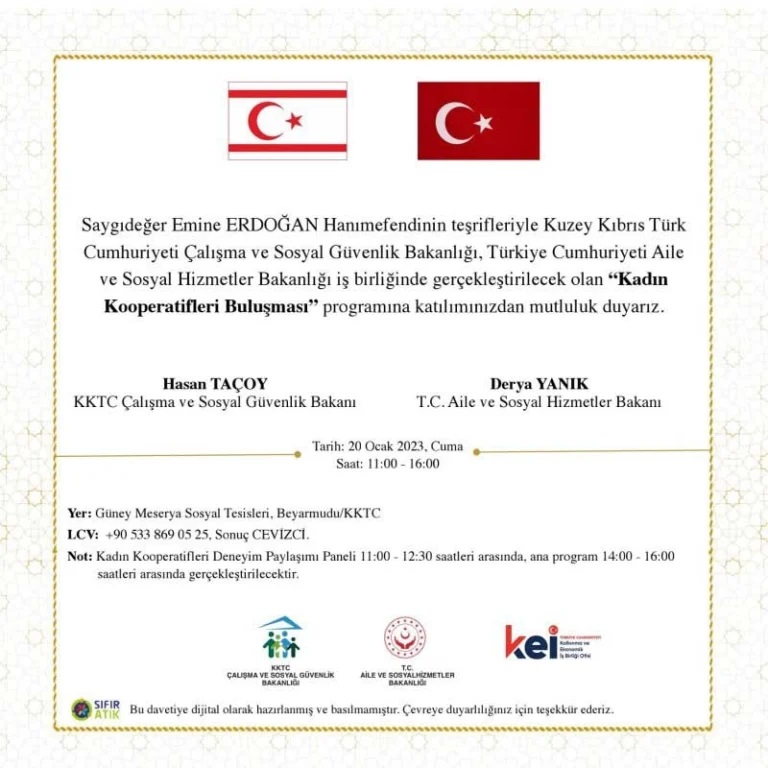 Türkiye Cumhuriyeti Cumhurbaşkanı Recep Tayyip Erdoğan’ın eşi Emine Erdoğan, Çalışma ve Sosyal Güvenlik Bakanlığı, Türkiye Cumhuriyeti Aile ve Sosyal Hizmetler Bakanlığı iş birliğinde gerçekleştirilecek olan “Kadın Kooperatifleri Buluşması” programına katılmak üzere Cuma günü KKTC’ye geliyor.