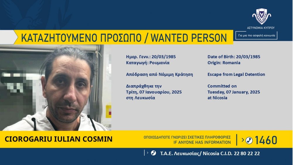 Polis gözetiminde tutulan 39 yaşındaki Ciorogariu Iulian Cosmin firar etti. Güney Kıbrıs polisi, firarinin yakalanması için geniş çaplı bir operasyon başlattı.