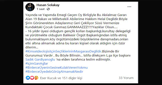 “Yayında ve yapımda emeği geçen oy birliğiyle garar alan 19 bakan ve milletvekili abilerime hakkım helal değildir. Böyle şirin görünerek adaylarımız geri çekiliyor süsü vermenize kundaktaki çocuk kanmaz. Yazıklar olsun. 16 yıldır üyesi olduğum gençlik kolları başkanlığı, kurultay delegeliği ve yürütmekte olduğum Balıkesir Örgüt Başkanlığından istifa etmiş bulunmaktayım. Köy örgütümüzdeki büyüklerime danışmadan, onları etki altına almamak adına bu kararı kişisel olarak aldığım için özür dilerim. Kimse ideolojisi için seçtiklerinin masgarası değildir. Bizim de bir gururumuz vardır, bu böyle bilinsin… İstifa dilekçem Sadık Gardiyanoğlu’na elden tarafımca teslim edilmiştir.”