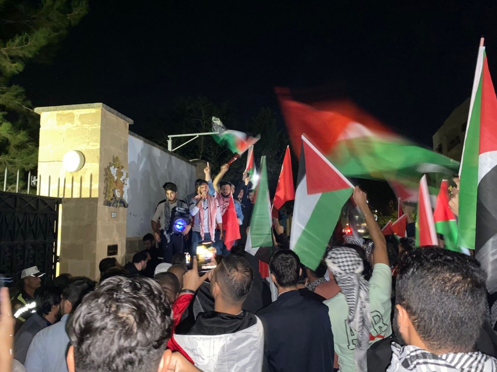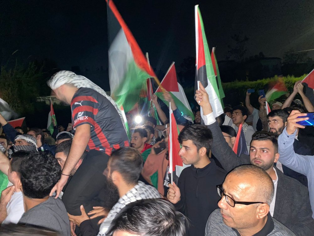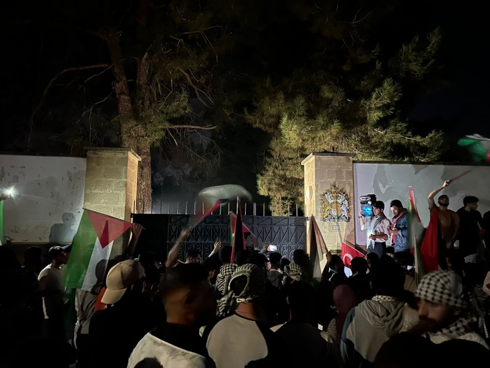 Türkiye, KKTC ve Filistin bayrakları taşıyan protestocular, okudukları basın bildirisinde İsrail'in bebek, çocuk, kadın ve erkek ayrımı yapmadan Filistinli sivilleri canlı yayında hastaneye yaptığı saldırı ile katlettiği belirtilerek, uluslararası toplumdan Gazze'ye yönelik saldırıları durdurmasını istendi.