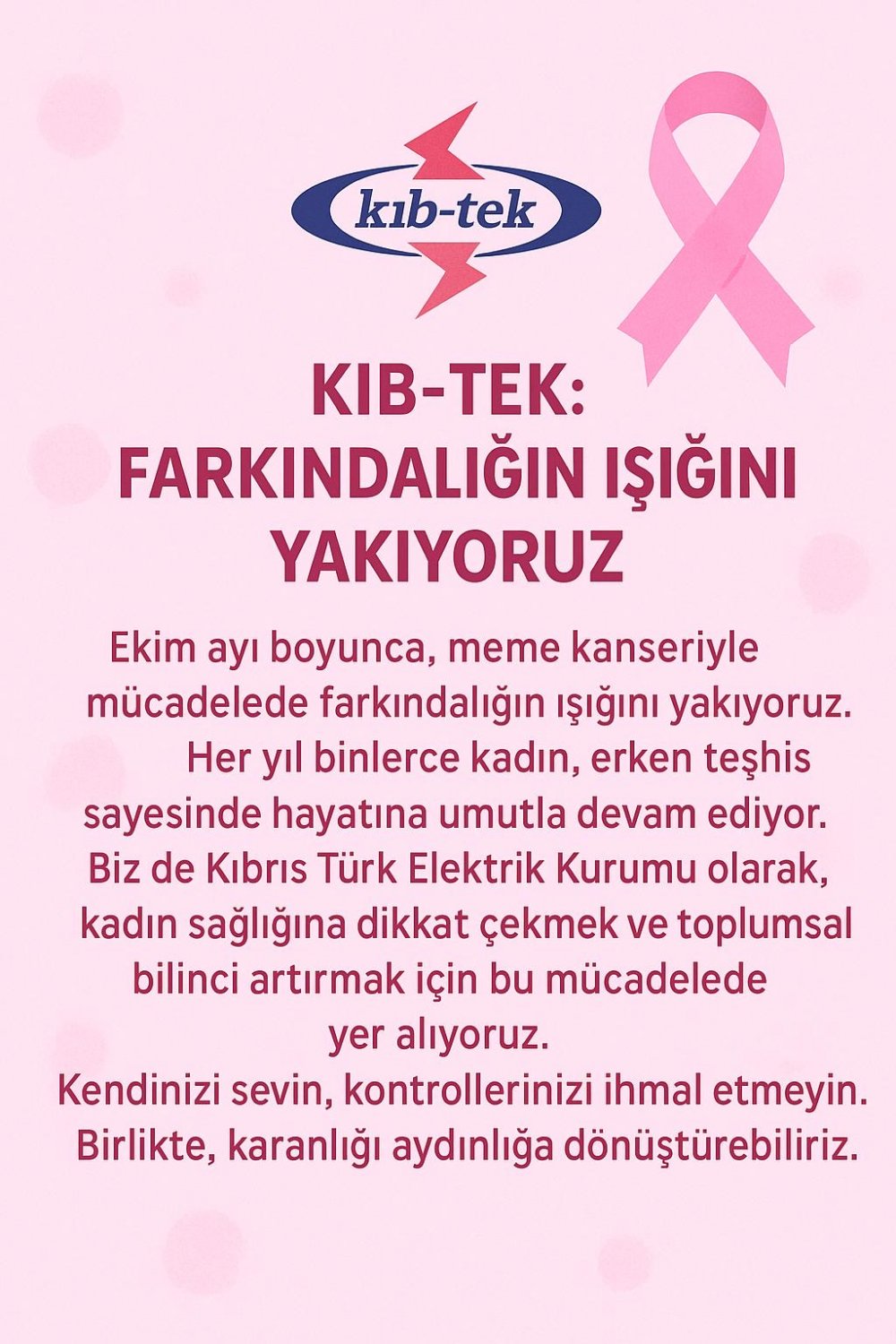 Kıbrıs Türk Elektrik Kurumu (KIB-TEK), Ekim ayının Meme Kanseri Farkındalık Ayı olması dolayısıyla yayımladığı açıklamada, erken teşhisin önemine dikkat çekerek toplum sağlığına yönelik farkındalık çağrısında bulundu.