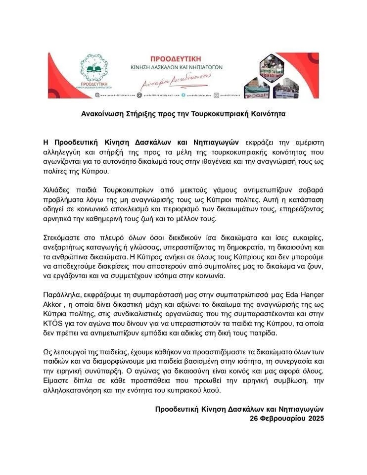 Proodeftiki İlkokul ve Okul Öncesi Öğretmenler Hareketi, Kıbrıs vatandaşlığı ve tanınma hakkı için mücadele eden Kıbrıs Türk toplumunun üyelerine sarsılmaz dayanışmasını ve desteğini ifade eden bir açıklama yaptı.