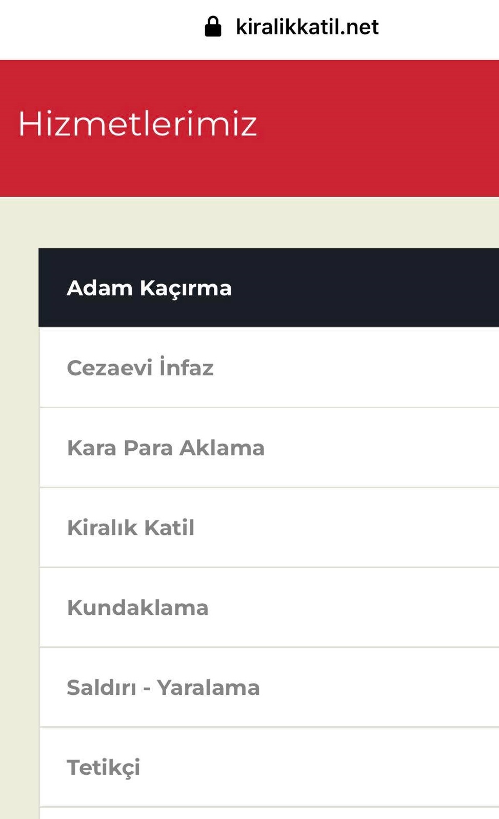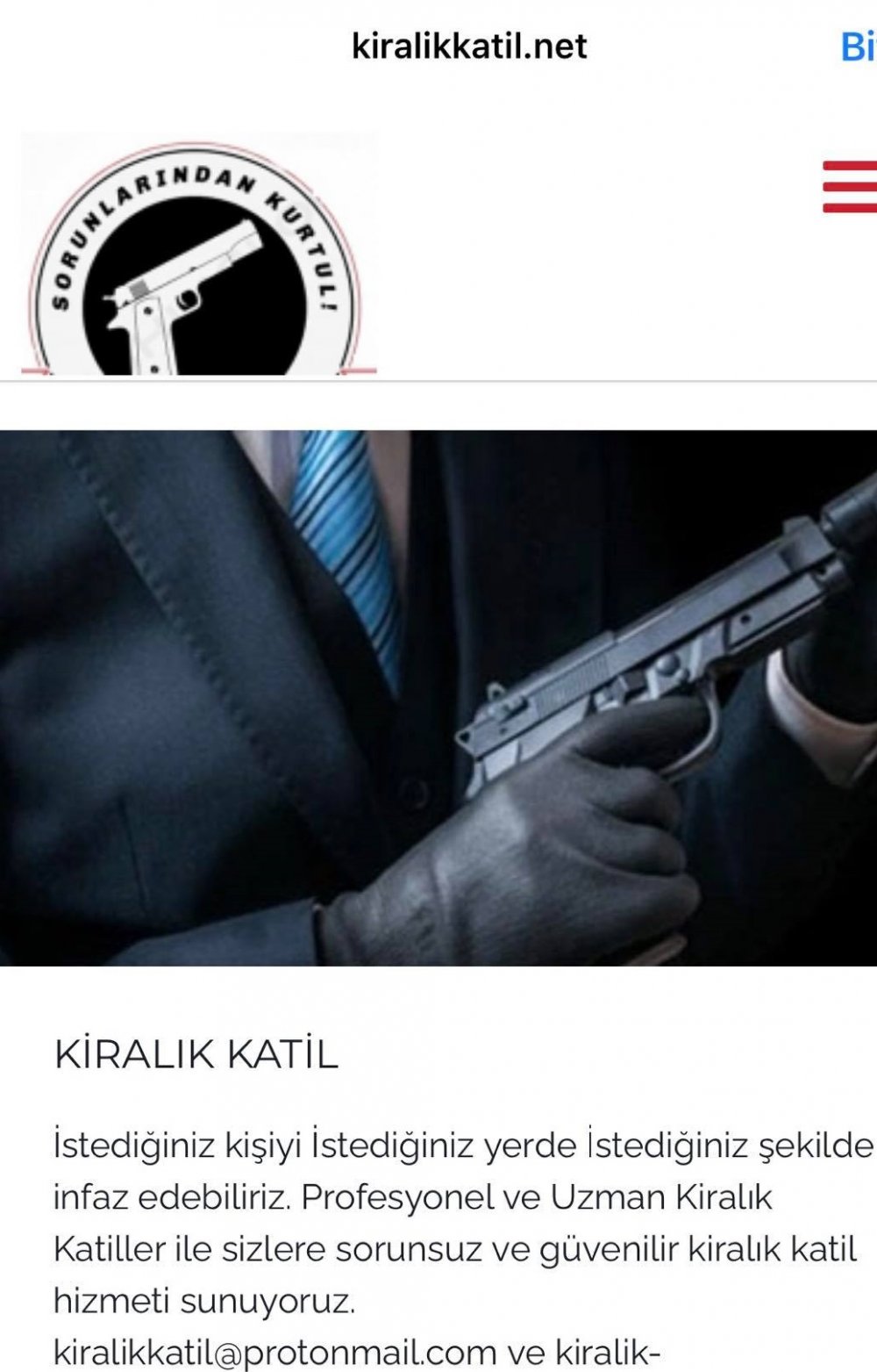 Adam öldürme-yaralama-adam kaçırma- kundaklama-zehir siparişi vb. hizmet almak isteyen kişi veya işletmelere hizmet vermek amacıyla kurulan kiralikkatil.net isimli web sitesinde “Profesyonel işini hakkıyla yapan ve ne kendini ne de sizi riske atmayacak bir kiralık katil tetikçi istiyorsanız biz buradayız” mesajı veriliyor.