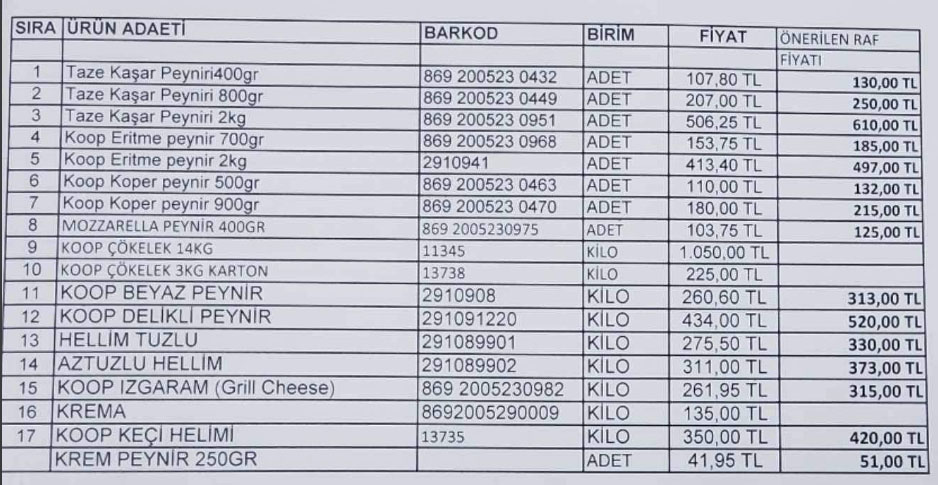 Koop Süt, süt ürünlerine de yeni fiyat belirlemesi yaptı. Bu bağlamda daha önce 275,50 TL’den satılan 1 kilo tuzlu hellimin fiyatı 330 TL’ye yükselirken, 1 adet 400 gram kaşar peynir 130 TL, 1 kilo beyaz peynir ise 313 TL oldu.