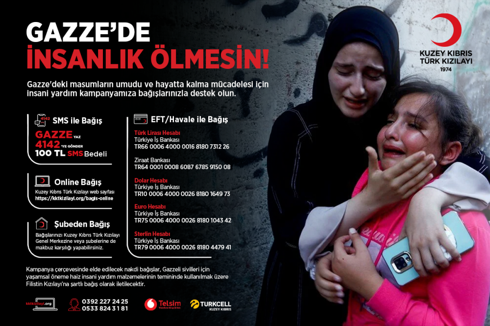 Kuzey Kıbrıs Türk Kızılayı, İsrail'in Gazze'de masum insanları ve sivil alt yapıyı hedef alan saldırılarının ardından, "Gazze’de İnsanlık Ölmesin" sloganıyla insani yardım kampanyası başlattı.