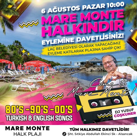 DJ Coşkuner’in performans sergileyeceği günde, “80’ler, 90’lar ve 2000’li” yılların şarkıları çalınacak. Belediye, tüm halkı eyleme çağırıp, halk plajına sahip çıkmaya davet etti.
