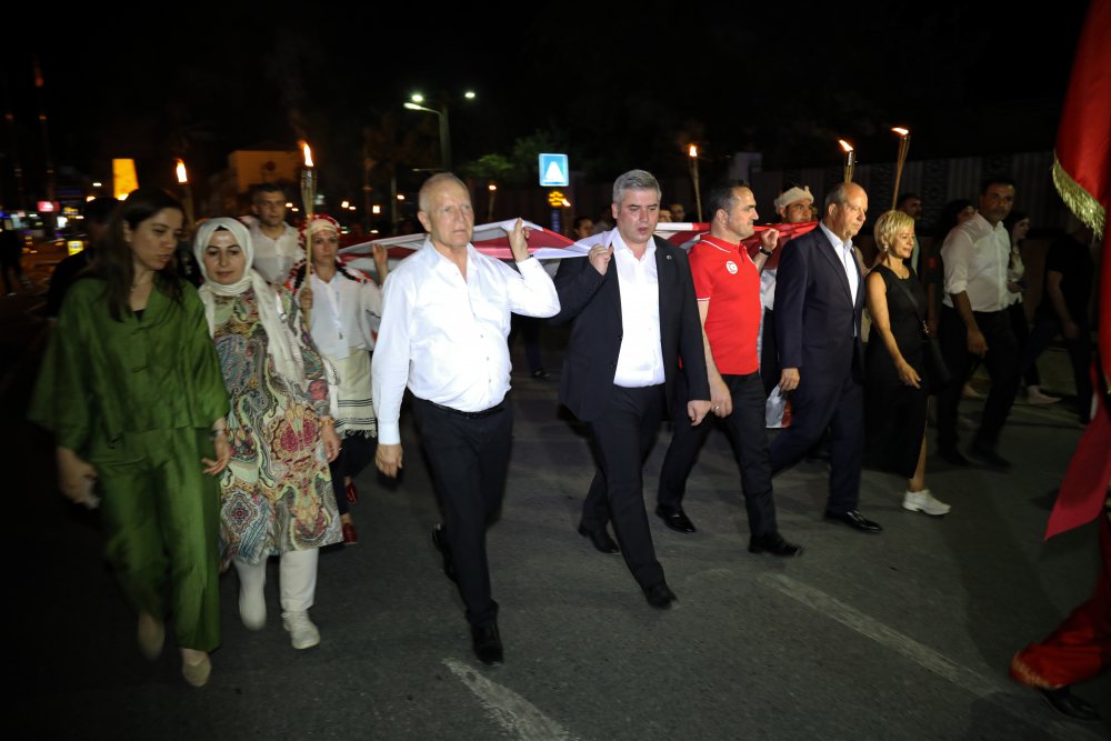 Türkiye'nin Lefkoşa Büyükelçiliği önünden mehteran eşliğinde katılımcıların dev bayraklar taşıyarak geçtiği "Bayrak Yürüyüşü" etkinliği Sarayönü Meydanı'na kadar sürdü.