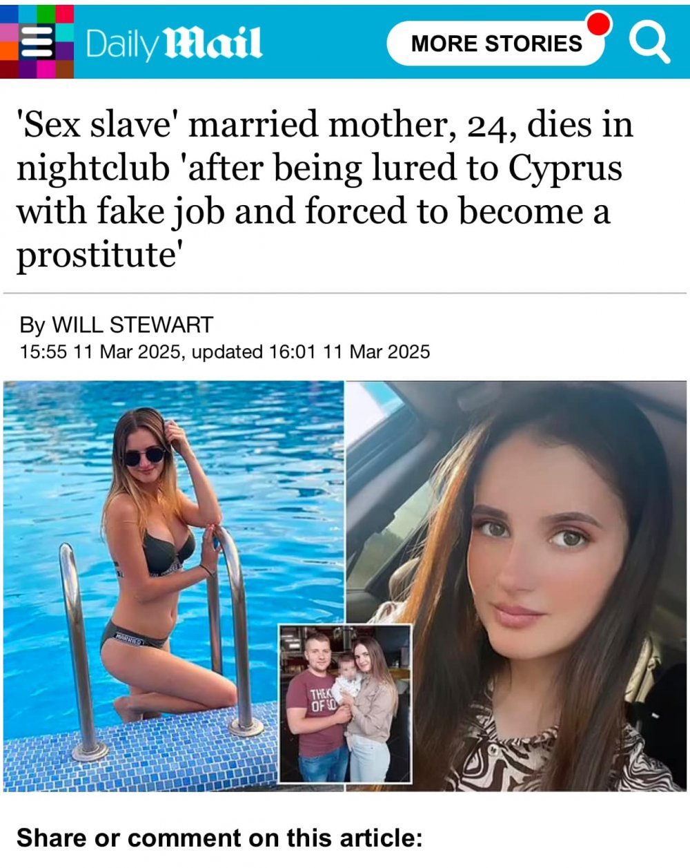 “Seks kölesi, evli 24 yaşındaki anne, sahte iş teklifiyle Kıbrıs’a getirilip fahişe olmaya zorlandıktan sonra gece kulübünde öldü” alt başlığını kullanan gazete, “4 yaşında bir oğlu olan Anastasia’nın” Alayköy’de bir gece kulübünün tuvaletinde ölü bulunduğunu yazdı.