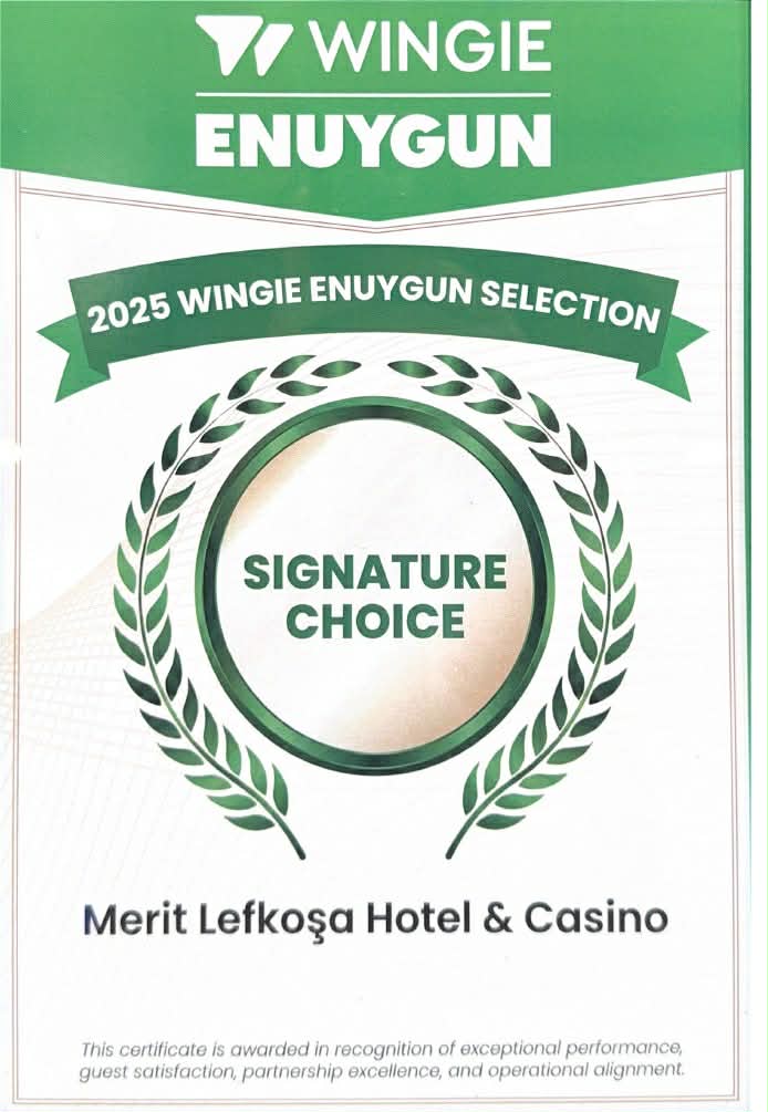 Kuzey Kıbrıs Türk Cumhuriyeti turizminin önemli temsilcilerinden Merit Lefkoşa Hotel & Casino, uluslararası seyahat platformu Wingie Enuygun tarafından verilen “2025 Wingie Enuygun Selection – Signature Choice” ödülüne layık görüldü.