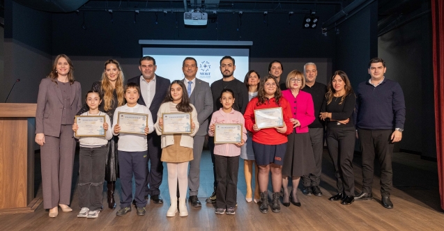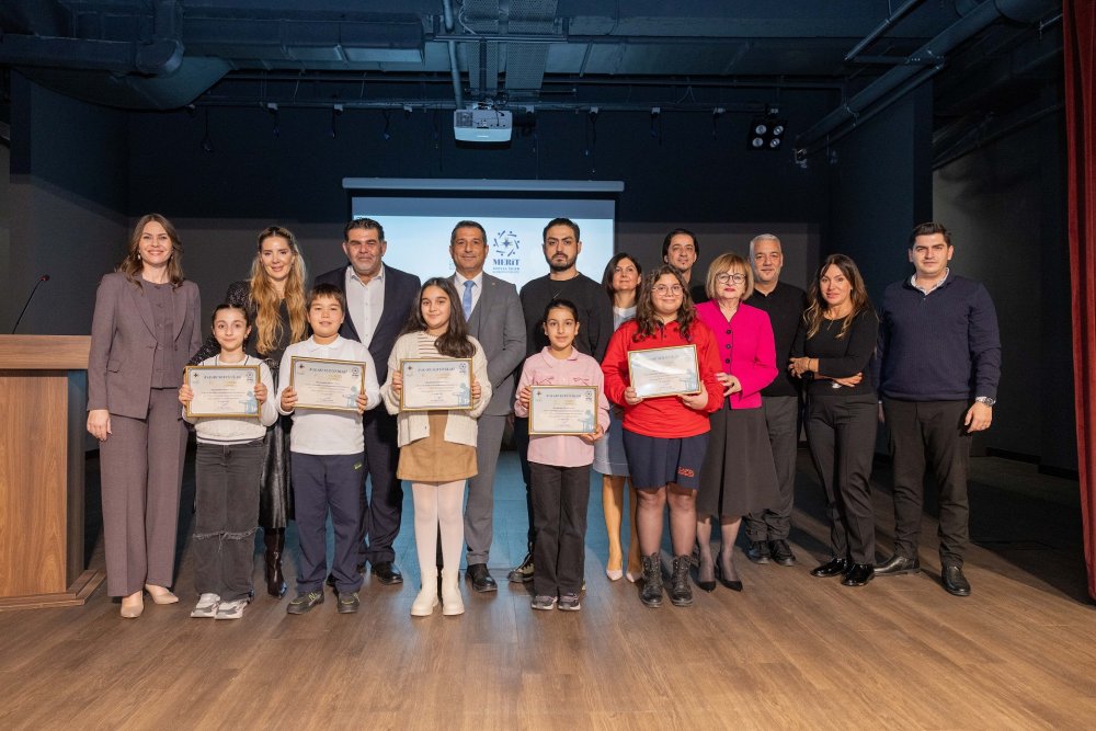 Mansiyon ödülü almaya hak kazanan Alsancak İlkokulu öğrencilerinden Atalay Çeliköz’e Okul Müdürü Sait Coşaner; İklim Gül Nersin’e de Merit Otelleri İnsan Kaynakları Grup Müdürü Ozan Kırtay ödüllerini verdi.