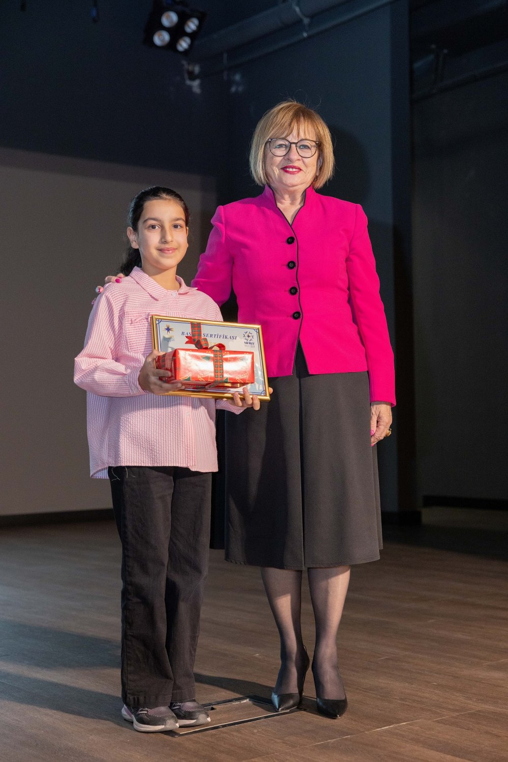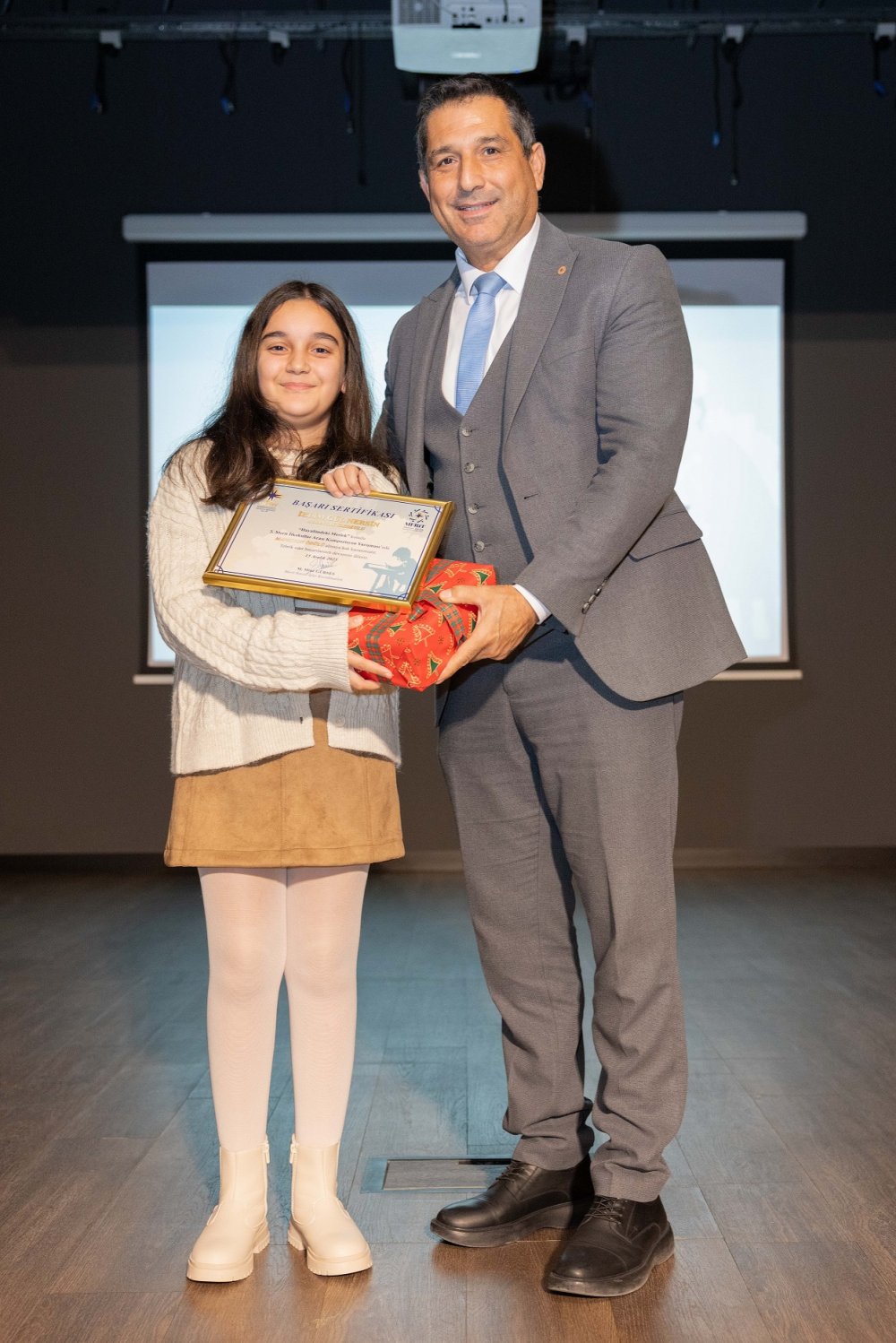 Yarışmada ikinci gelen Alsancak İlkokulu öğrencisi Lina Topaloğlu ödülünü Merit Otelleri Grup Genel Müdürü Aybars Kutluba’dan aldı.