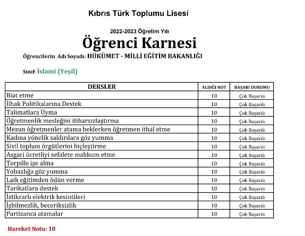 Sendika tarafından paylaşılan karnede, “İslami (Yeşil)” sınıftan mezun olan Hükümetim, biat etmekten, torpille işe almaya; asgari ücretliyi sefalete mahkûm etmekten; ilhak politikalarına desteğe kadar tüm “derslerinden” başarıyla geçtiği gözlemlendi.