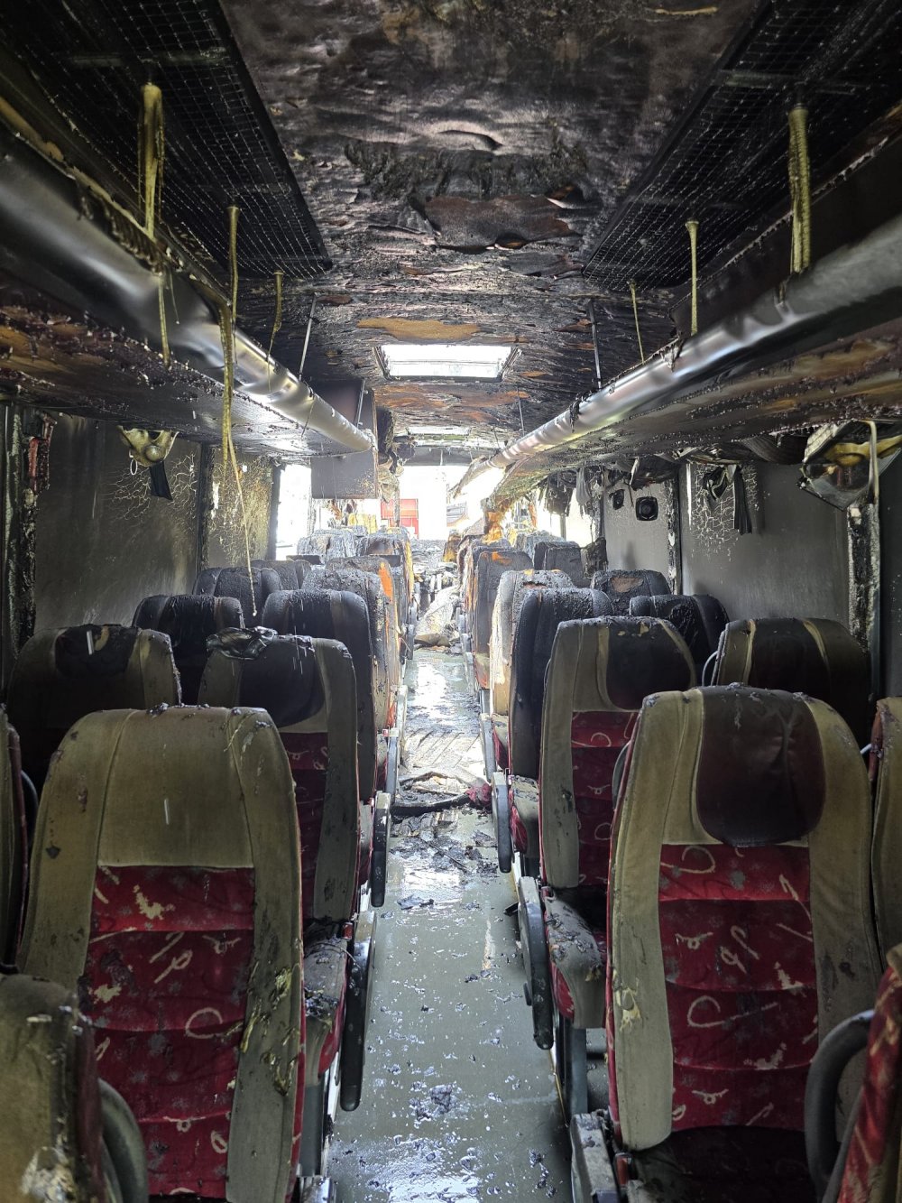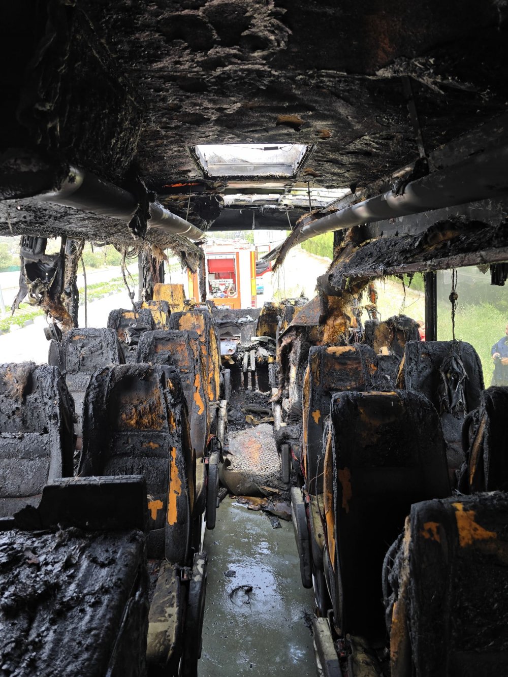 Yangın sonucu, aracın üç metrelik tavan kısmı ile 25 adet koltuğu tamamen, 22 adet koltuğu ise kısmen yanarak zarar görürken, çıkan ısıdan dolayı ise otobüsün arka ile 3 adet yan camları patlamış ve iç kısımları da kullanılmaz hale geldi.