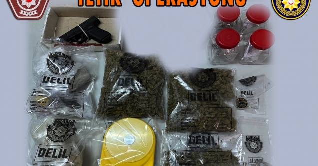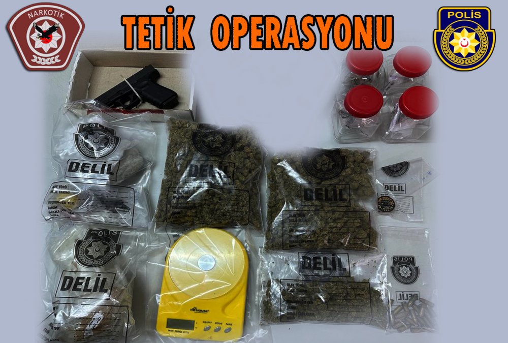 Operasyon kapsamında bahse konu şahsın üzerinde ve konu ikametgah içerisinde yapılan aramada; yaklaşık 1 gram ağırlığında eroin türü, yaklaşık 6 gram ağırlığında kokain türü ile yaklaşık 506 gram ağırlığında hintkeneviri(skunk) türü uyuşturucu olduğuna inanılan maddeler, üzerinde uyuşturucu madde kalıntısı olduğuna inanılan 2 adet hassas terazi, içerisinde uyuşturucu madde kalıntısı olan bir adet öğütücü, 23 adet canlı mermi ve uyuşturucu madde satışından elde edildiğine inanılan toplam 25.285 TL, 250 ABD Doları, 360 Sterlin ve 325 Euro bulunarak emare olarak alındı.