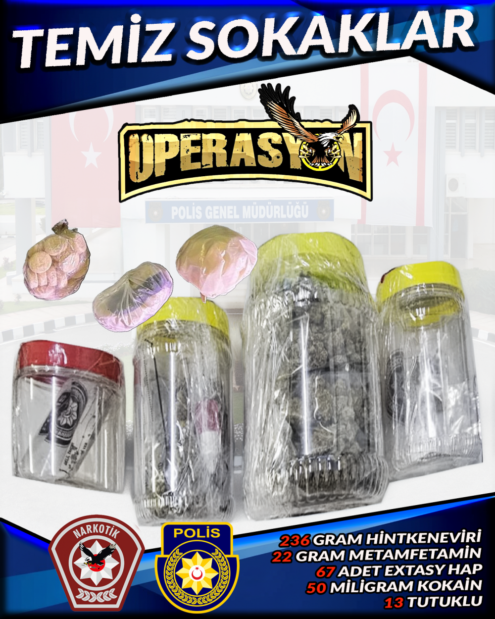 Polis tarafından Gazimağusa, Girne ve İskele’de düzenlenen operasyonda, satışa hazır paketler halinde hintkeneviri, metamfetamin, kokain, sentetik cannabinoid ve MDMA türü uyuşturucu maddeler ele geçirildi, 13 kişi tutuklandı.
