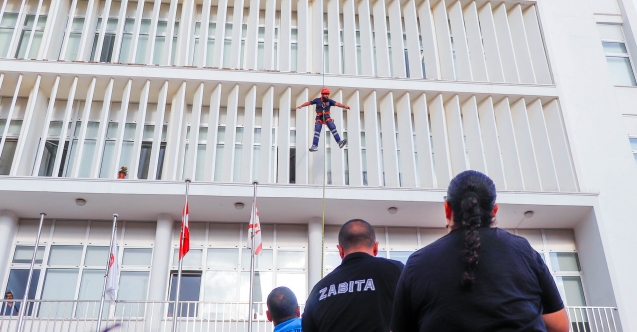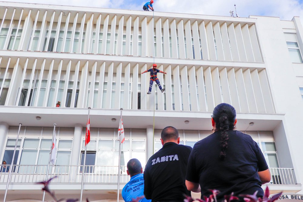 Sivil Savunma Teşkilatı Başkanlığı Gazimağusa Bölge Müdürlüğü Eğitimcileri Hasan Özboltaşlı ve Osman Demirli’nin hem teorik bilgiler aktardığı, hem de uygulamalı olarak yönettiği tatbikat, Belediye binasının içerisinden yaralı kurtarma ile dam üzerinde mahsur kalan birinin Sivil Savunma tarafından halatla tahliyesi olmak üzere 2 aşamada gerçekleşti.