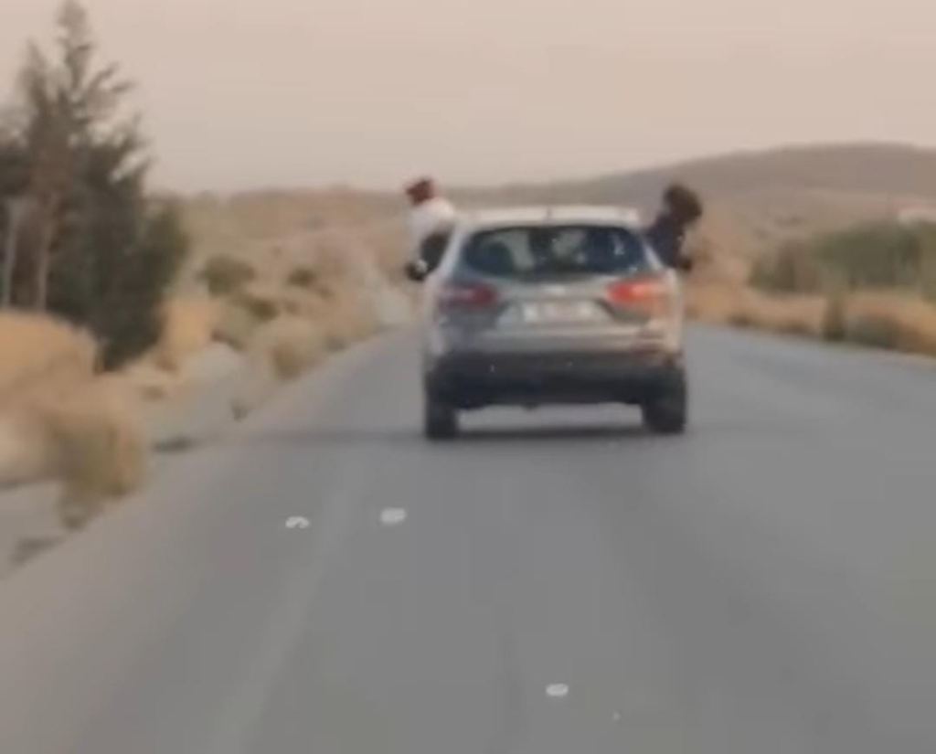 Seyir halindeki araçta yolcu olarak bulunan iki şahsın, aracın camlarından bellerinin yarısında kadar çıkarak insan hayatına tehlike arz edecek şekildeki görüntülerinin paylaşılması üzerine polis ekipleri harekete geçti.