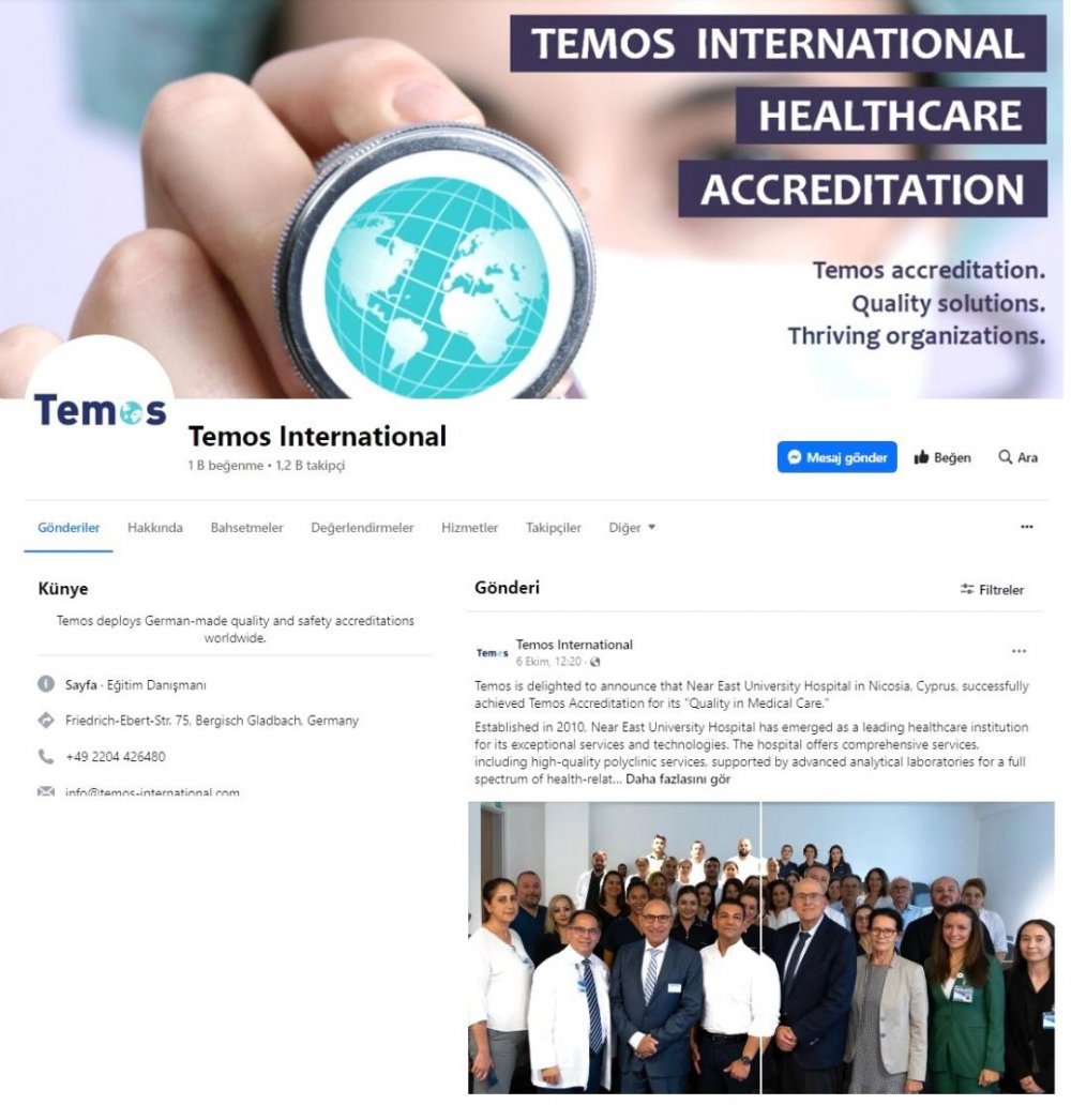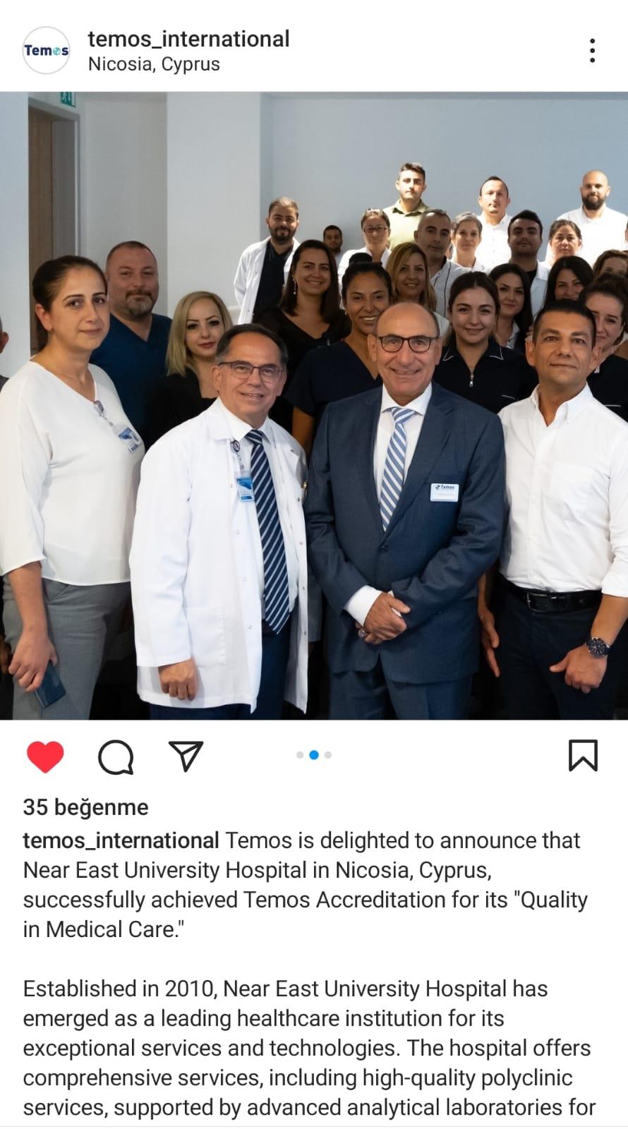Yakın Doğu Üniversitesi Hastanesi’ni; sağlık süreçlerinden operasyonel yetkinliğe kadar 4 farklı kategoride, 19 başlık altında ve 500’ün üzerinde standartta denetleyen Almanya merkezli uluslararası akreditasyon kurumu TEMOS (Trust, Effective Medicine, Optimize Services), “Quality In Medical Care” uluslararası akreditasyon sertifikası ile Yakın Doğu Üniversitesi Hastanesi’nin hizmet kalitesini tescillediğini sosyal medya hesaplarından bütün dünyaya duyurdu.