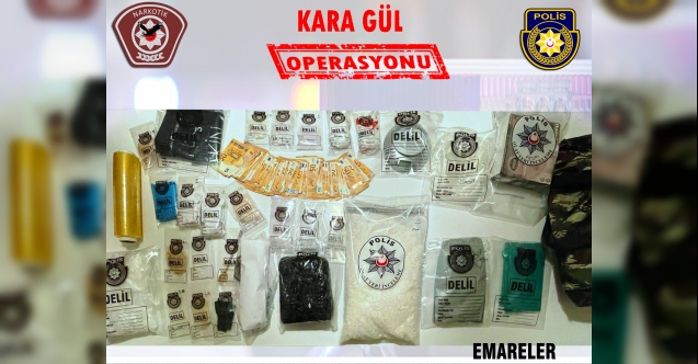 “Kara Gül Operasyonu” adı verilen operasyon kapsamında bir ikametgahta yapılan aramada, yaklaşık 3 kilo ağırlığında metamfetamin, 3 kilo ağırlığında afyon ve 700 gram ağırlığında eroin türü uyuşturucu olduğuna inanılan madde ile, üzerinde uyuşturucu madde kalıntısı olduğuna inanılan hassas terazi ve uyuşturucu satışından elde edildiğine inanılan 3 bin 280 Euro nakit para bulunarak emare olarak alındı.