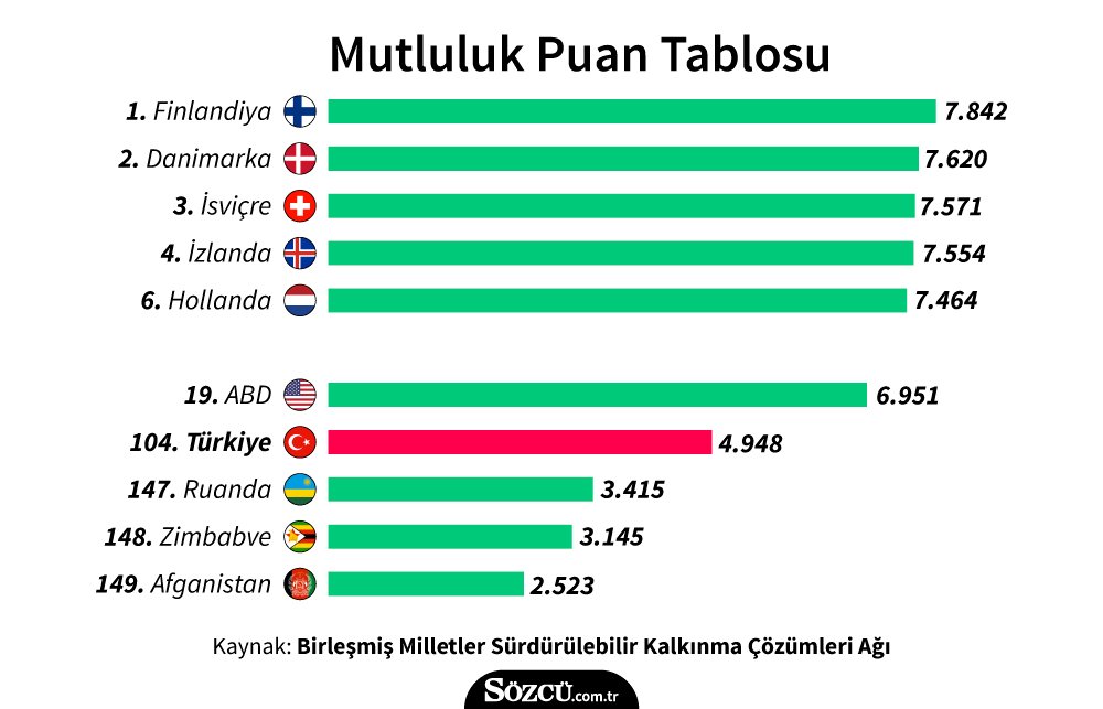 Dünyanın en mutlu ülkeleri sıralamasında Finlandiya birinci olurken, Afganistan 149 ülke arasında son sırada yer aldı. 2017'de 69 sırada yer alan ve geçen sene 93. olan Türkiye, bu yıl 104. sıraya kadar geriledi