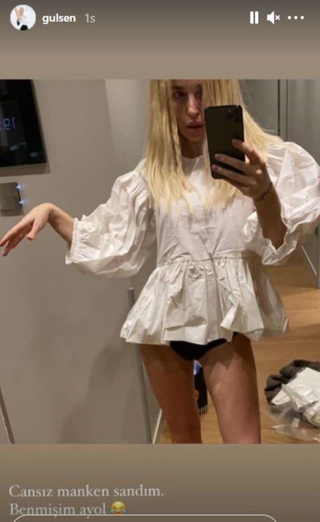Gülşen, ayna karşısında kıyafet denediği sırada altında sadece iç çamaşırı varken paylaşım yaptı. Hikayesinin altına "Cansız manken sandım, benmişim ayol" notunu ekledi.
