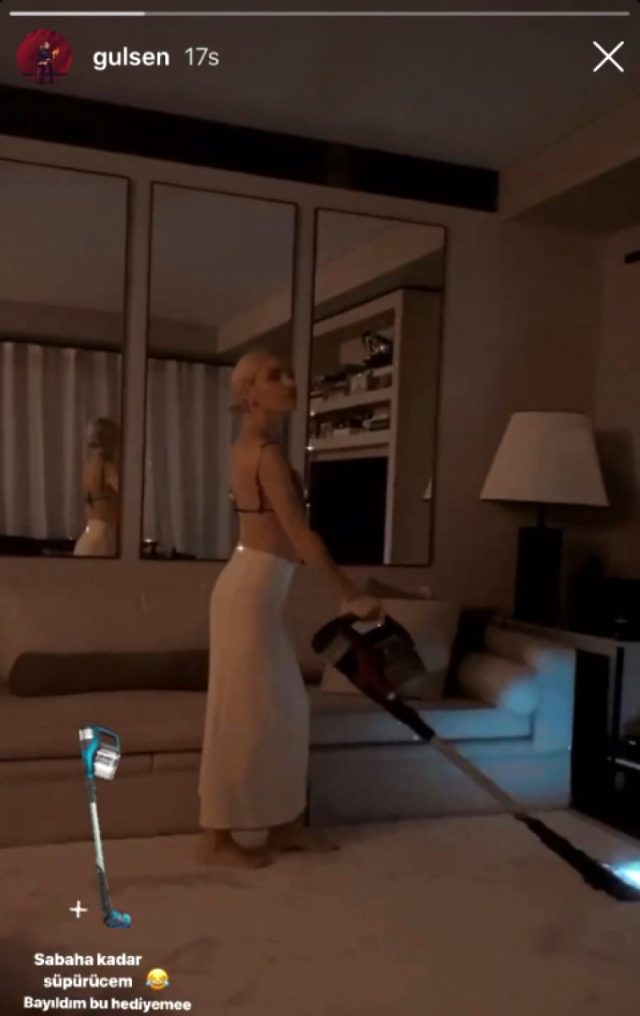 Gülşen, bu kez ev süpürdüğü anları sosyal medya hesabından paylaştı. Sütyenle iş yapan Gülşen, elektrikli süpürge paylaşımına "Sabaha dek süpüreceğim" yazdı.