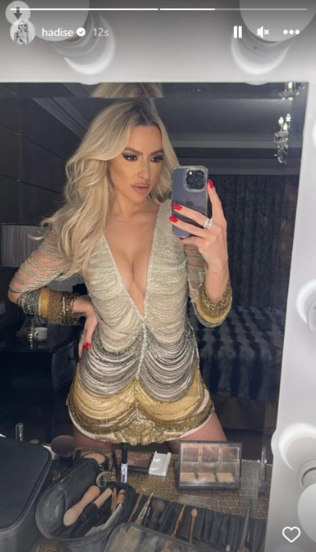 Özel hayatının yanı sıra tercih ettiği sahne kıyafetleriyle de adından söz ettiren Hadise, son olarak derin göğüs dekolteli işlemeli mini bir elbise giydi. Şarkıcının ayna karşısında verdiği poz ise kısa sürede sosyal medyada gündem oldu.