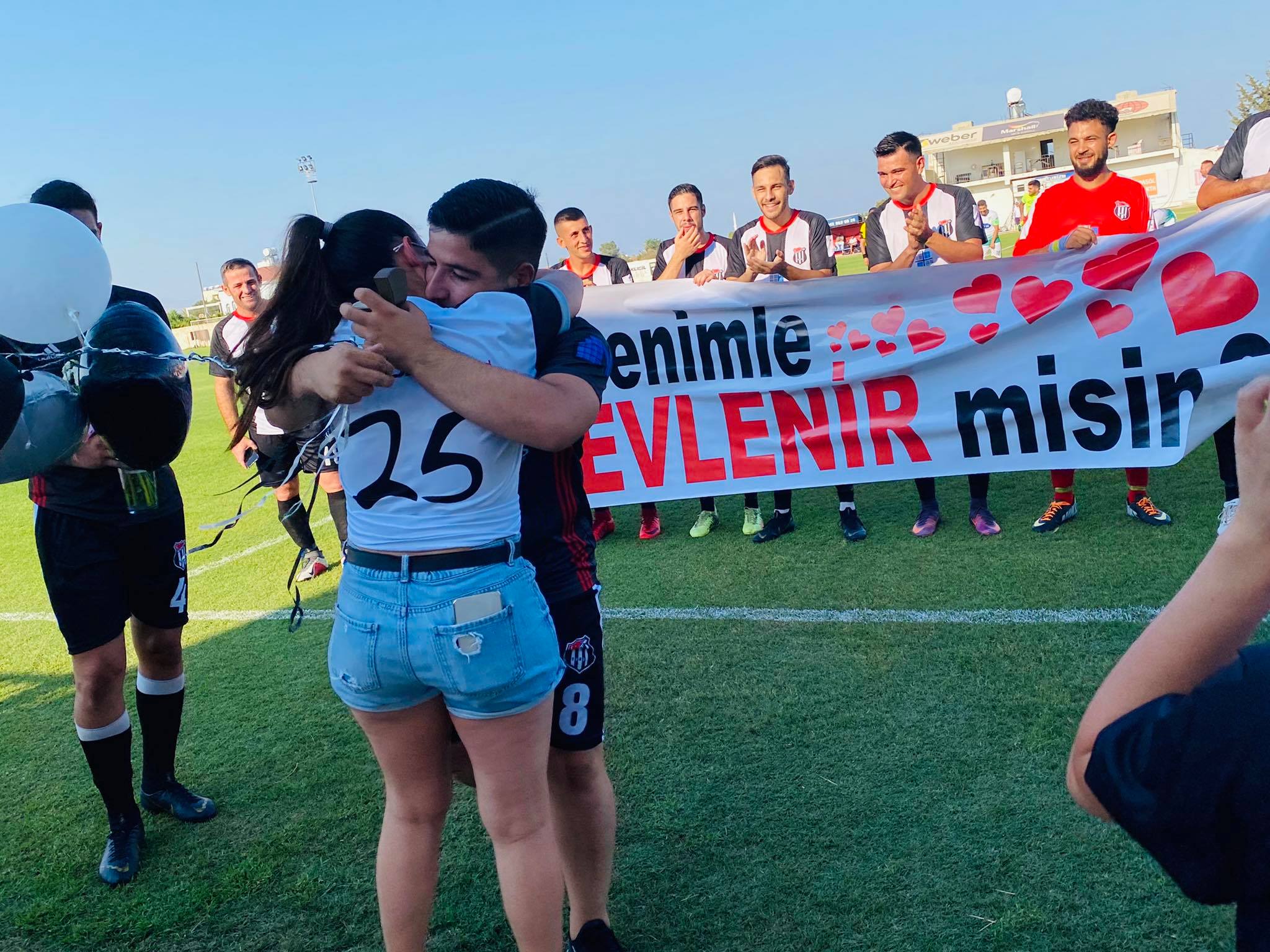 Evlilik teklifinin yazılı olduğu ve fotoğraflarının bulunduğupankartı gören genç kız, büyük bir şaşkınlık yaşadı. “Benimle evlenir misin?” yazan pankartın önünde genç çift, birbirine sarıldı. Takımın renklerindeki balonlar ve romantik müzik eşliğinde Zihni Öztürk, yüzüğü Remziye Şafaklı'ya taktı.(Mha)