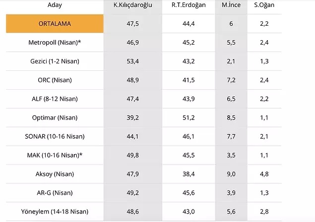 Euronews'in aktardığına göre, Nisan ayında anket açıklayan 10 anket şirketinin (Metropoll, Gezici, ORC, ALF, Optimar, SONAR, MAK; Aksoy, AR-G, Yöneylem) ortalamasında sonuçlar oldukça dikkat çekici.