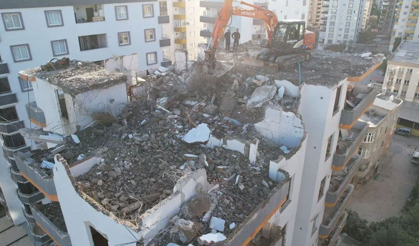 Adana’da ağır hasarlı olduğu için yıkımı devam eden İnci apartmanının kolonlarından tencere çıktı