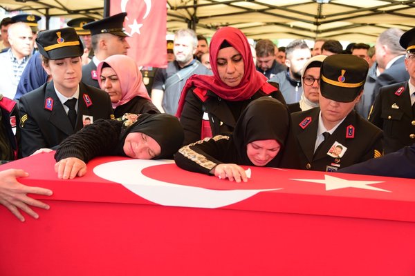 Şehidin eşi Edanur Bozlağan ise tabuta sarılarak eşine seslendi. Bu sırada şehidin 6 aylık oğlu Yağız Asaf'ın sürekli ağlaması ise törene katılanları gözyaşlarına boğdu. Güçlükle ayakta durabilen şehidin eşi ve annesine sağlık ekipleri müdahale etti.